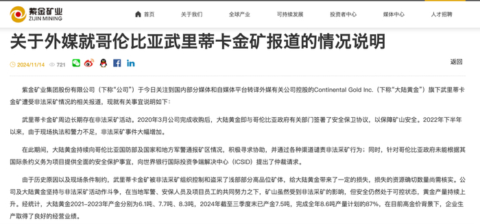 2023年5月,紫金矿业曾在官网发布《关于哥伦比亚武里蒂卡金矿遇袭事件的强烈谴责声明》(下称“《声明》”)。