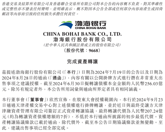 不过,渤海银行也在想办法出清不良资产。2024年3月和7月,该行分别发布公告出清39.67亿元和289.65亿元不良资产。其中,第一笔以现场招标的形式当日转让,计提资产减值准备约17.26亿元。