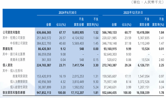 从贷款投放来看,截至2024年上半年末,渤海银行的个人贷款余额为2247.65亿元,占比23.71%,较2023年末下降17.59%。其中,个人贷款的不良贷款余额为74.18亿元,较2023年末上升21.07%;不良贷款率为3.30%,较2023年末上涨1.05个百分点。
