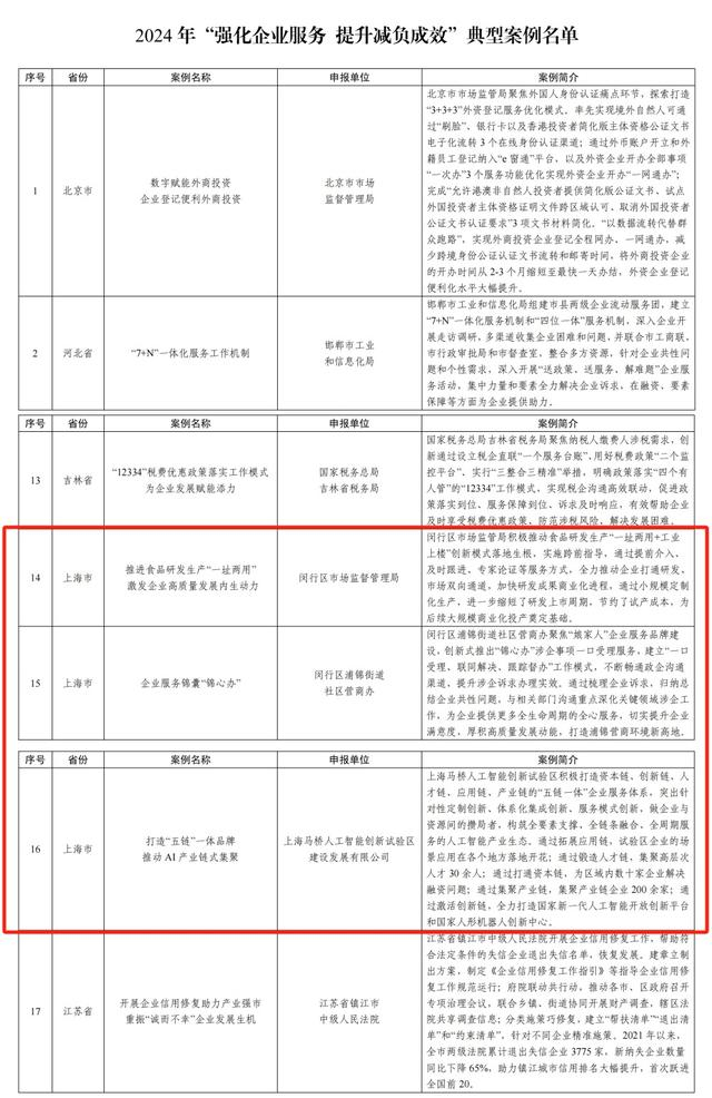 11月7日,工业和信息化部运行监测协调局发布2024年“强化企业服务 提升减负成效”典型案例名单,闵行区市场监督管理局、浦锦街道社区营商办和上海马桥人工智能创新试验区建设发展有限公司申报的三个案例成功入选,闵行区也成为上海市唯一入选该名单的区县。