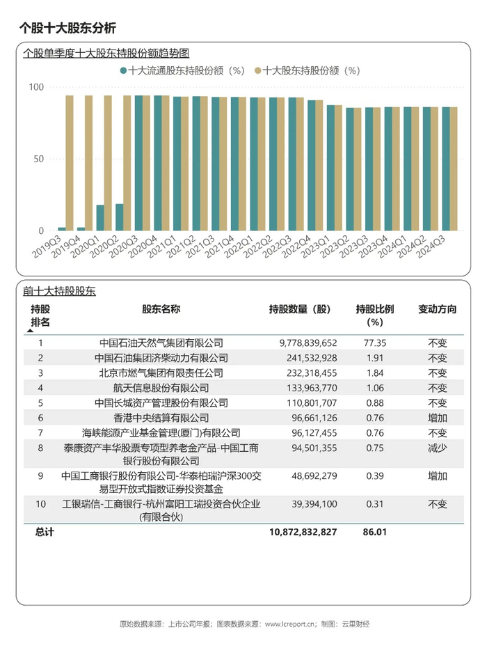 2)股本及十大股东持股比例报告期末,中油资本的总发行股本为126.42亿股,在2020Q3季度执行转股后,股本一直保持稳定至今。