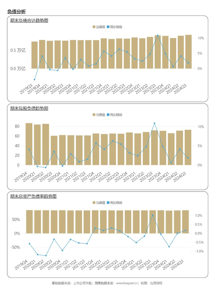 报告期末中油资本的负债合计为9,190.12亿元,总资产负债率为83.18%,排名行业第54位,负债压力较重。周期内总资产负债率保持稳定。