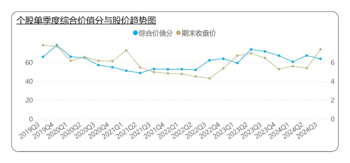 接下来我们来看下中油资本的综合价值(注2)。在2024Q3季度,中油资本的综合价值分为63.77分,行业排名第15,与去上个季度相比下降3个名次。