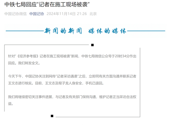 中铁七局回应记者施工现场被袭:正配合警方调查,中国记协发声