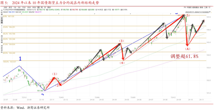 进一步从内部结构来看,当前或处于4浪中的子浪(B)调整末端。10年国债期货主力合约自2023年10月末进入大3浪上涨周期,内部走出子浪(1)-(3)-(5)延长形态,并于2024年9月24日达到(5)浪高点,此后经历了(A)浪大幅回调(超斐波那契比例61.8%),目前处于(B)浪上升阶段,而B浪内部亦走出小分型结构。