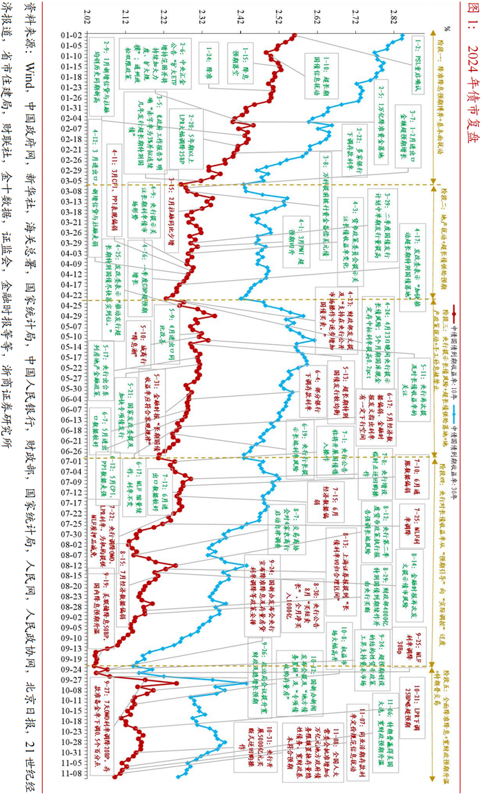 2024年以来,债市收益率总体走低,期间经历五次较大幅度回调,利率曲线牛陡,具体交易脉络可划分为五个阶段:第一阶段(1月1日至3月6日)主线为“降准降息预期博弈+基本面信息扰动” ;第二阶段(3月7日至4月23日)主线为“地产宽松预期+超长债供给预期+机构行为扰动”;第三阶段(4月24日至6月28日)主线为“央行提示长债风险+超长债供给落地+地产政策扰动+手工补息被禁止”;第四阶段(7月1日至9月23日)主线为“央行对长债收益率从“预期引导”向“实际调控”过渡”;第五阶段(9月24日至今)主线为“全面降准降息+宽财政预期升温+特朗普交易”。
