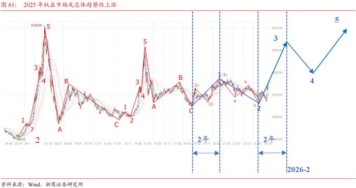 从技术面来看,2025年处于3浪上行通道。时间维度上,本轮五浪周期中1浪上涨走完耗时约2年,2浪回调耗时约3年,整体耗时长于前面两轮五浪周期,且前两轮周期中3浪走完耗时均长于1浪,按斐波那契比例1:1估算,预计本轮3浪走完或耗时大于2年。考虑3浪起点为2024年2月5日,因此3浪终点或在2026年2月以后,或对应2025年股牛行情。