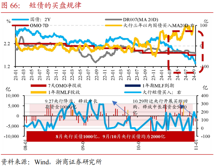 本轮短国债行情核心由于大行买入,但21年至23年6月之前,大行实际上在二级市场匀速买入(MA20D在20亿附近),同时买入方向和券种收益率同向为主,说明本质上大行前期是配置逻辑,23年7月之后,短债和资金脱锚,核心是大行出于“套息/平衡久期/比价/央行投放流动性”。