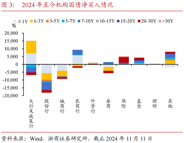 机构行为视角,大行及政策行主力净买入中短债,保险大幅买入超长债,基金净买入以中长债及超长债为主。大行及政策行主要净买入1Y内短债及1-3Y品种;农商行主要净买入1Y内短债及7-10Y长债;券商主要净买入7-10Y品种,并净卖出1Y内短债及1-3Y与20-30Y品种;保险大幅加仓20-30Y品种;其他类机构(以境外机构为主)主要买入1-3Y品种及7-10Y品种。