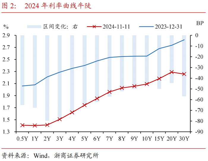 曲线形态上,2024年利率曲线牛陡,中短端表现更优。全年来看,在央行降准降息及“资产荒”逻辑下,债市做多情绪较浓,虽然期间受地产宽松预期、宽财政预期以及央行对长债收益率的风险提示扰动而出现五次回调,但利率总体呈现下行趋势,在央行“买短卖长”信号下,中短端表现更优。