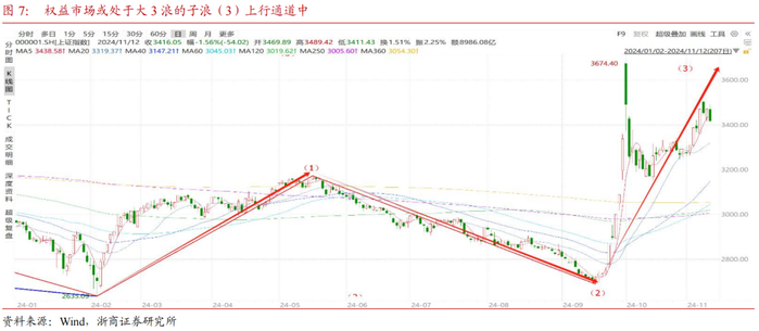 从大3浪内部结构来看,或走出子浪(1)至(5)延长浪推动上涨形态。上证指数日K线于2月5日进入子浪(1)上行,并于5月20日进入子浪(2)回调,9月18日进入子浪(3)强势推动上涨。9月24日以来,央行创设结构性货币政策工具稳定资本市场并于9月26日政治局会议提出房地产“止跌回稳”,助推权益市场强势拉升,推动浪(3)走出内部结构分型。