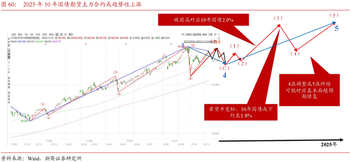 在货币宽松配合下,2025年10年国债活跃券收益率或下行至1.8%。若10年国债期货主力合约破前高则对应10年国债活跃券下破2.0%,货币宽松背景下,10年国债或将下探至1.8%。若基本面出现超预期修复,对应(4)浪调整或(5)浪结束后调整浪阶段。
