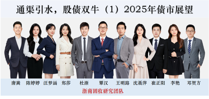 2)债市:①长债:10年国债期货主力合约2025年或进入新一轮上涨阶段,在货币宽松配合下,2025年10年国债收益率或下行至1.8%;②短债及存单:存单供给压力加剧,建议年初配置,骑乘策略为主;短债关注央行投放流动性行为下的大行买入需求,2年国债收益率下限或在1%附近;③组合:建议一季度保持较高的流动性,跨年前适当加久期,做好利率下行准备,待二季度基本面出现企稳信号后,适当降低组合久期,应对可能的阶段性调整。