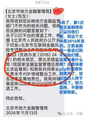 11月13日,有出借人收到了北市金管局的回复:持续督促X山区推进X富XX清退工作。