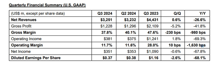 第三财季调整后运营利润率-17.8%,上年同期13.6%。第三财季英特尔代工(Intel Foundry)营收43.5亿美元,分析师预期44.4亿美元;此外,对于包括人工智能芯片在内的数据中心业务增长9%,达到 33.5 亿美元,超乎预期。