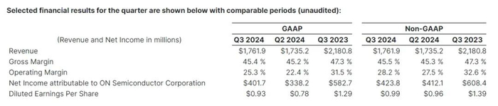 安森美半导体第三季度营收环比增长2%至17.6亿美元,符合预期;非公认会计准则每股收益为0.99美元,同比增长0.02美元;调整后营业利润为4.965亿美元,超出分析师预期的4.834亿美元。