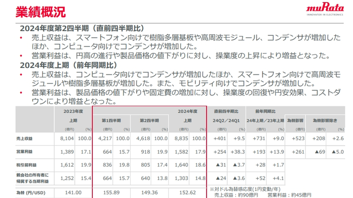 据村田财报,2024年4月至9月,销售额同比增加了9.0%,达到8835亿日元,营业利润增加了13.9%,达到1582亿日元。