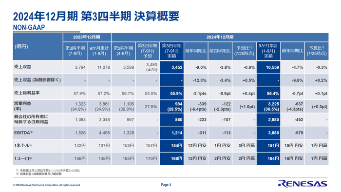 据瑞萨电子第三季度的财务业绩,销售额同比下降9.0%至3,453亿日元,毛利率下降2.1个百分点至55.9%。营业利润为984亿日元,减少339亿日元,营业利润率为28.5%,下降6.4个百分点,导致销售额和利润下降。