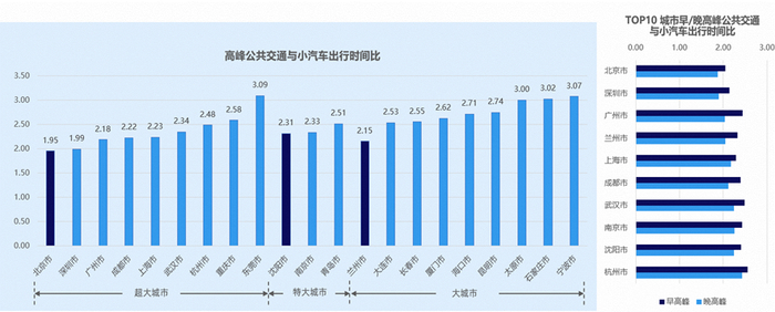 对大多数城市而言,早高峰的公共交通与小汽车出行时间比略高于晚高峰。在时间效率体感最佳的排名前十城市均呈现这样的趋势。