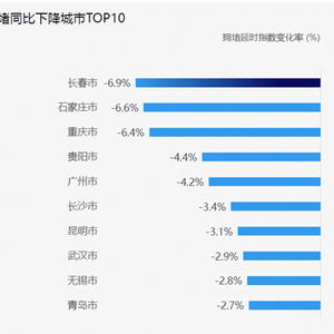 同比2023年三季度,全国50个主要城市里,有16个城市的路网高峰拥堵延时指数下降,占比32%;有5个城市该指数上升,占比10%;29个城市基本保持不变,占比58%。在拥堵下降的城市中,长春降幅最大,石家庄、重庆、贵阳等次之。