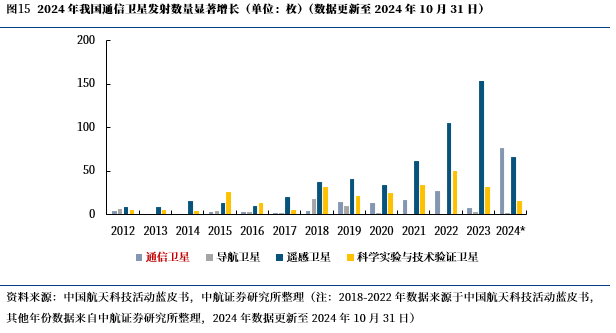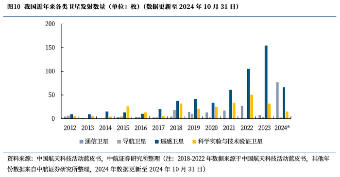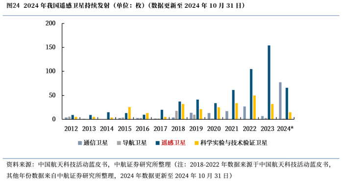 2024年以来,我国卫星发射节奏依旧向好。根据我们的统计,截至2024年10月31日,2024年我国各类卫星发射数量已超过160颗。具体各类型卫星建设重点变化如下: