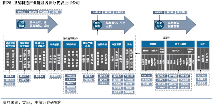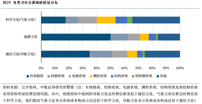 ② 关注通信及遥感小卫星在有效载荷、控制系统、电源系统以及测控系统环节上具有低成本及产业化能力的企业,或具有较高技术水平(毛利率较高)、正处于产业化过程中的企业。卫星空间系统的分系统主要由结构系统、热控制系统、电源系统、姿控系统、轨控系统及测控系统构成。如下图所示,各类卫星空间段分系统成本构成中,有效载荷、控制系统、电源系统以及测控系统的成本之和占比均超过50%。在有效载荷、控制系统、电源系统以及测控系统等高价值量领域中,已经具有低成本及产业化能力的企业更有望在卫星制造行业提速之际具有先发优势,而具有较高技术水平(毛利率较高),正处于产业化过程中的企业有望获得相对更高的业绩弹性,消化相对较高的估值。