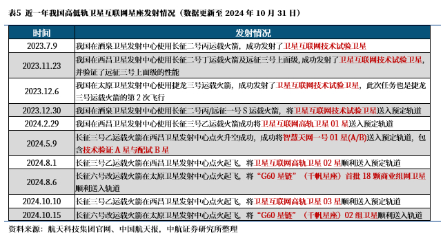 以上均显示出我国卫星互联网正式建设进程有望迎来提速,而伴随卫星互联网星座正式建设的开始,卫星互联网空间基础设施建设相关上市公司的业绩也将有望迎来兑现。我国卫星互联网近期发射情况汇总如下表所示。