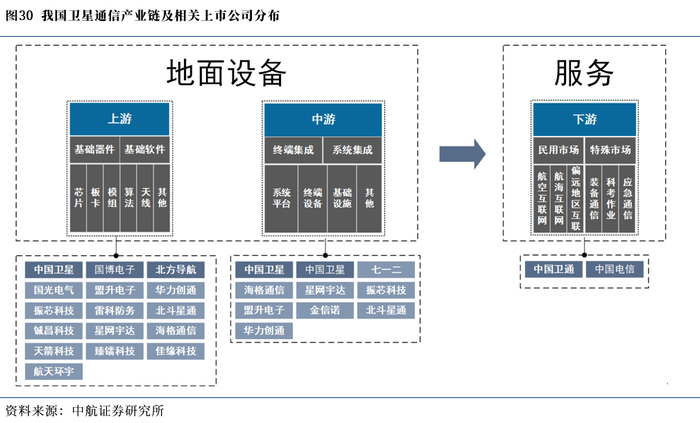 卫星通信应用产业链主要为地面设备和运营商构成,相关上市公司分布情况如下图所示。