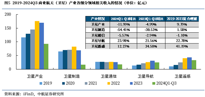 2024年前三季度,卫星产业及其细分领域的收入情况依然延续2024年上半年的惯性放缓趋势。2024年Q1-Q3,卫星产业整体增速有所放缓,其中,卫星制造、卫星通信、卫星遥感三大细分领域的同比增速均持续放缓,卫星导航同比增速较去年继续提升。各细分板块如下: