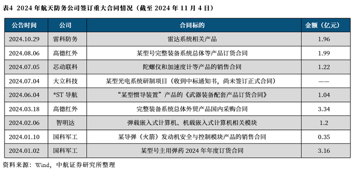 2024年10月29日,雷科防务公告,公司于近日收到与某客户签订的雷达系统相关产品的订货合同,合同金额为1.96亿元。此外,2024年以来多家航天防务板块公司披露了重大合同签订情况,显示出航天防务板块部分订单有所落地,业绩有望兑现在在2024年年末或2025年的利润表中。