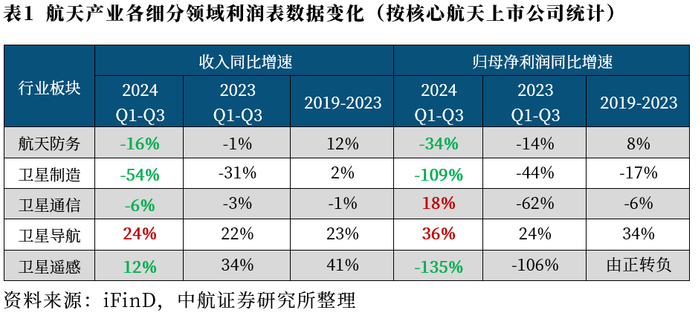 截至2024年10月31日,航天产业上市公司三季报已经披露完毕。根据上市公司整体三季报统计分析,航天防务、卫星制造、卫星通信以及卫星遥感等多个细分领域的需求侧扰动依旧存在,企业收入或净利润同比增速进一步下滑,且需求侧短期内依旧承压。具体数据如下: