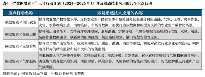 继2023年底的“万亿国债”计划之后,2024年1月4日,国家数据局等17部门发布联合印发的《“数据要素×”三年行动计划(2024—2026年)》,《行动计划》旨在充分发挥数据要素乘数效应,赋能经济社会发展。《行动计划》明确了12个重点行动,其中多个行动涉及遥感技术的应用,包括数据要素×现代农业、数据要素×交通运输、数据要素×应急管理等,详见下表。《“数据要素×”三年行动计划》有望助力卫星遥感应用在应急、农业、交通运输等to G端的需求释放,扩大卫星遥感企业的收入规模。