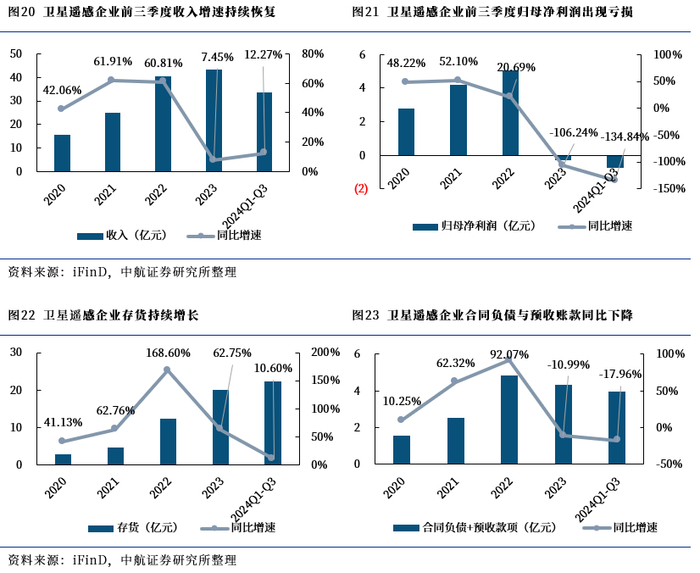 ④ 卫星遥感:2024年前三季度,卫星遥感企业收入整体同比增速修复至10%以上,尽管净利润增速出现下滑,但考虑到Q4季度的净利润是遥感企业全年占比最大的时段,且企业存货维持增长,遥感卫星等空间基础设施建设不断完善,预计下游需求依旧充足,行业增速将迎来修复。