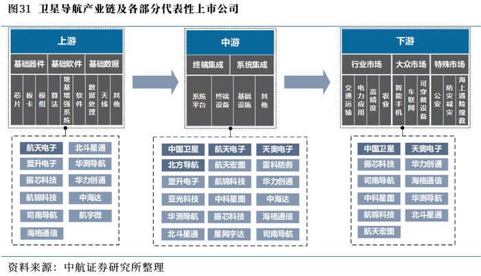 ① 重点关注北斗应用产业中上游领域具有明确市场布局或已经拥有较大市占率的企业。由于芯片、板卡、模组、数据处理、天线等基础器件和基础软件作为各北斗应用终端的共同设备基础,需求将伴随北斗应用市场下游的拓展保持稳定的增长,由于上游基础器件对企业在中下游市场拓展(价格以及性能层面)的影响重大,从当前各中下游厂商开始向上游拓展来看,北斗上游产业链的竞争会更加激烈,建议关注具有明确下游市场布局或已经拥有较大市占率的上游企业;