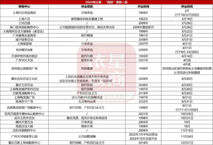 据铱星云商不完全统计,今年以来,截至目前,至少有20+个商业项目宣布停业,包含购物中心和百货商场两大类。从时间线上看,上海六百在宣布闭店改造时,已有72年历史;上海妇女用品商店、南昌百货大楼均有60余年历史。