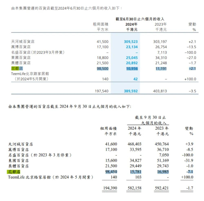 我们翻阅了粤海投资近一年的年报,发现在其运营的6个百货店中,广州天河城奥莱公园的租用面积是所有项目中最大的,但收入却一直垫底。其2024年中期报告显示,广州天河城奥莱公园上半年的收入为1095.6万港元,对比2023年同期的1119.1万港元收入下降2.1%;其2024年前三季度业绩报告显示,期间广州天河城奥莱公园的收入为1578.1万港元,对去2023年同期的1698.5万港元收入下降7.1%,这或许是导致项目闭店的主要原因之一。