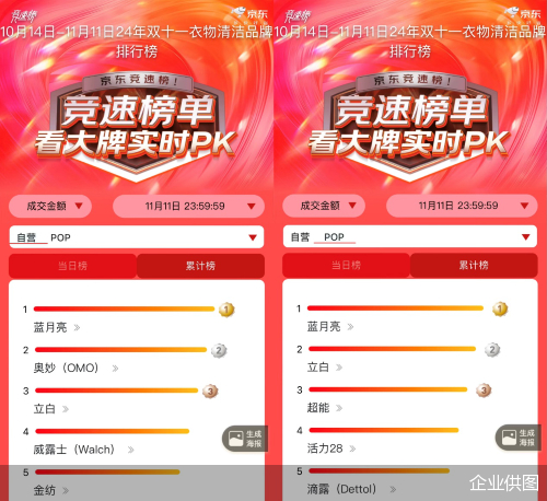 与此同时,在京东平台,蓝月亮不仅占据了11月11日24年双十一衣物清洁品牌自营、POP当日榜的双料榜首,更是占据了10月14日-11月11日衣物清洁品牌自营、POP累计榜第一名。此外,依据天猫超市10月11日至11月11日家清类目榜单中的品牌累计成交金额数据,蓝月亮在非纸品类品牌占据TOP1。