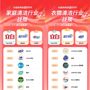 今年双十一期间,抖音平台上蓝月亮不仅斩获家庭清洁榜&衣物清洁榜10.18-11.11累计销售额双第一;还在10.8-11.11的抖音超级品牌日中登顶衣物清洁/家庭清洁品牌榜、店铺榜,商品榜三大榜的榜首,并斩获了全品类支付GMV超过4亿元的好成绩。
