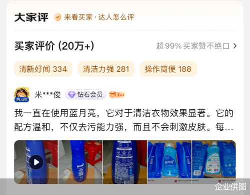 在蓝月亮京东自营旗舰店,至尊洗衣液商详页的买家好评率高达99%,“清洁力强”“操作简便”等评价出现极为频繁。