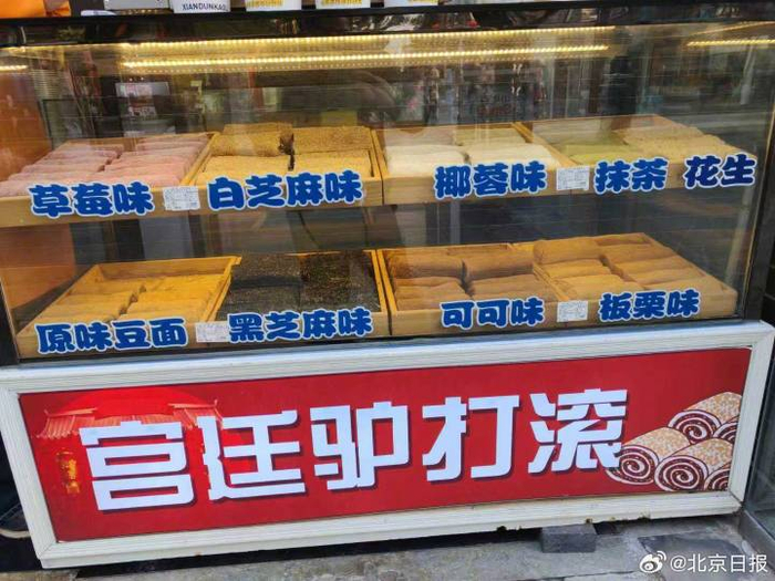 记者走访前门、鼓楼、南锣鼓巷、什刹海等旅游景区,到处都能看见售卖驴打滚的店铺。南锣鼓巷,一家店把各种馅心的驴打滚展示出来,有豆沙、黑芝麻、白芝麻、板栗等比较传统的口味,也有抹茶、巧克力、草莓等新颖口味。这种驴打滚整整齐齐码好,一大卷一大卷的,现切现卖,单价38元/斤。不只是南锣鼓巷,在其他热门景区,所有这种新口味的网红驴打滚,都卖38元/斤,价钱出奇地统一。