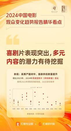 《2024中国电影观众变化趋势报告》由灯塔研究院×灯塔专业版联合于金鸡奖·鼓浪屿论坛特别发布。《报告》显示,2024年节假日档期票房活跃,女性及95后观众成为电影市场观影主力。在内容偏好方面,数据显示,2024年,观众对喜剧、悬疑、科幻、动作四大类型电影青睐有加,喜剧类型片供给数量及票房贡献突出。这些“王道类型”的优质电影内容仍然具有吸引观众走进电影院的号召力优势。