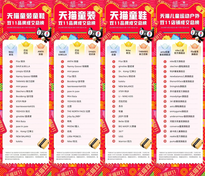 不过,天猫童装童鞋品牌成交总榜上,仍是巴拉巴拉品牌高居第一,耐克和安踏分列二三位。童装方面,双十一成交额最高的三个品牌是巴拉巴拉、DAVE&BELLA、优衣库,安踏排名第四,童鞋方面,成交额最高的是耐克、安踏和泰兰尼斯。
