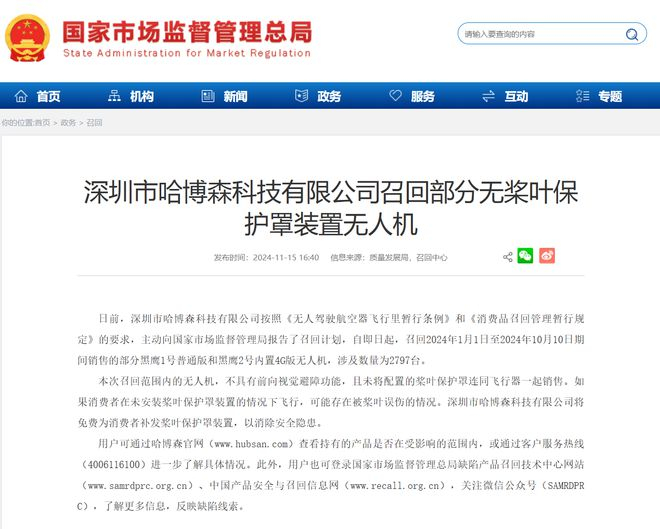 IT之家 11 月 15 日消息,IT之家从国家市场监督管理总局获悉,日前,深圳市哈博森科技有限公司按照《无人驾驶航空器飞行里暂行条例》和《消费品召回管理暂行规定》的要求,主动向国家市场监督管理局报告了召回计划,自即日起,召回 2024 年 1 月 1 日至 2024 年 10 月 10 日期间销售的部分黑鹰 1 号普通版和黑鹰 2 号内置 4G 版无人机,涉及数量为 2797 台。