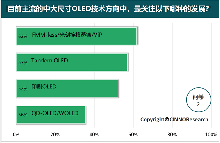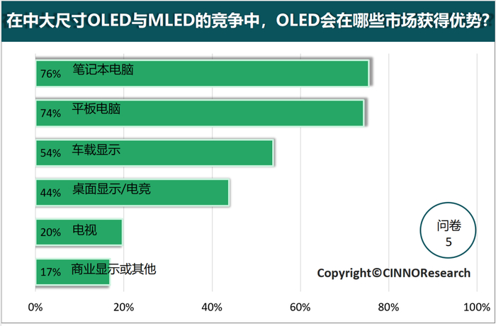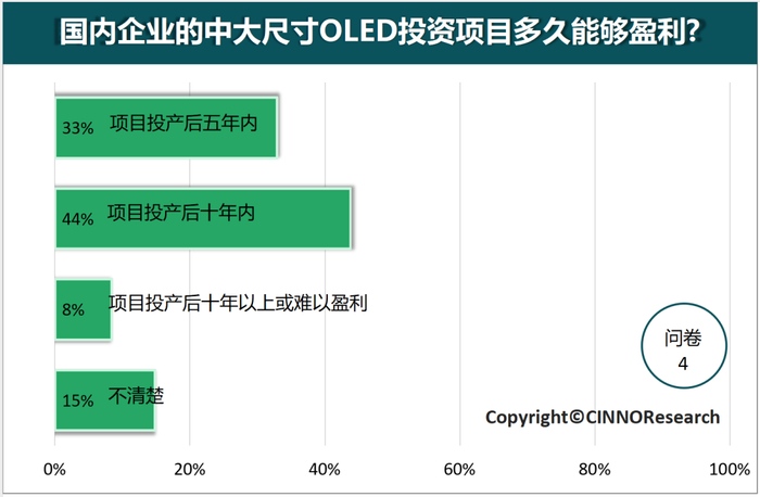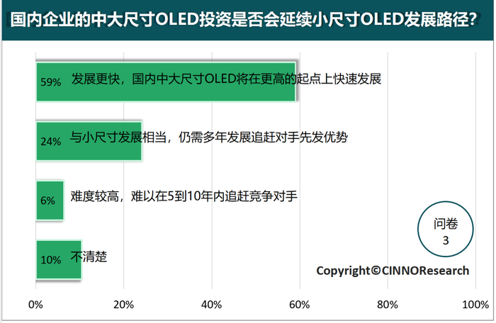 根据活动前期公开问卷调查显示,超过三分之二的受访者看好中大尺寸OLED的发展。关于技术关注度,参与者的选项与国内企业的布局相符,印证了当前技术趋势。针对国内企业的技术积累,59%的受访者认为它们将在更高起点上推动中大尺寸OLED的快速发展。关于盈利预期,尽管多数人预计需要10年才能实现盈利,但整体上大家对行业的未来充满信心。关于OLED与Mini LED的竞争问题,问卷调查结果显示,大家更看好OLED在笔记本、平板和车载等应用领域与Mini LED技术的竞争优势。