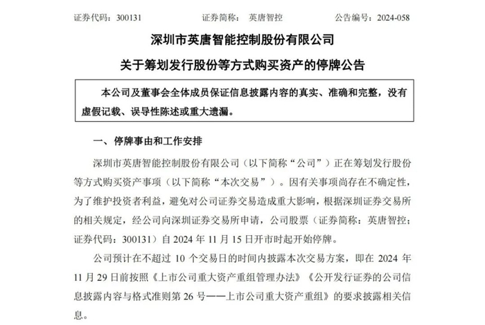 11月14日晚,英唐智控公告显示,公司正在筹划发行股份及支付现金方式购买资产事项,并募集配套资金。标的资产为深圳市爱协生科技股份有限公司(简称“爱协生”),公司股票自2024年11月15日开市起停牌并在2024年11月29日前披露交易方案。