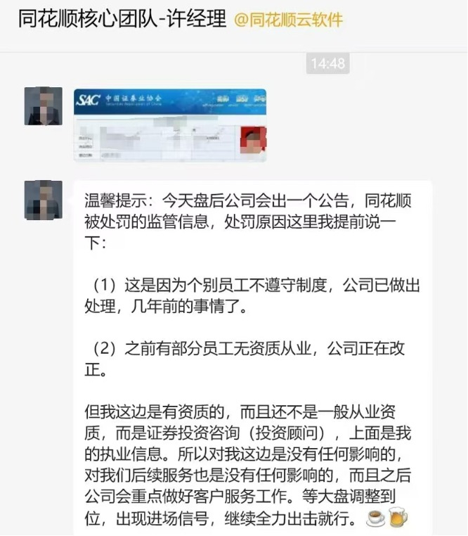 也有显示为“同花顺核心团队”的截屏信息中提到,“同花顺此前个别员工不遵守制度,公司已做出处理,几年前的事情了。之前有部分员工无资质从业,公司正在改正。”
