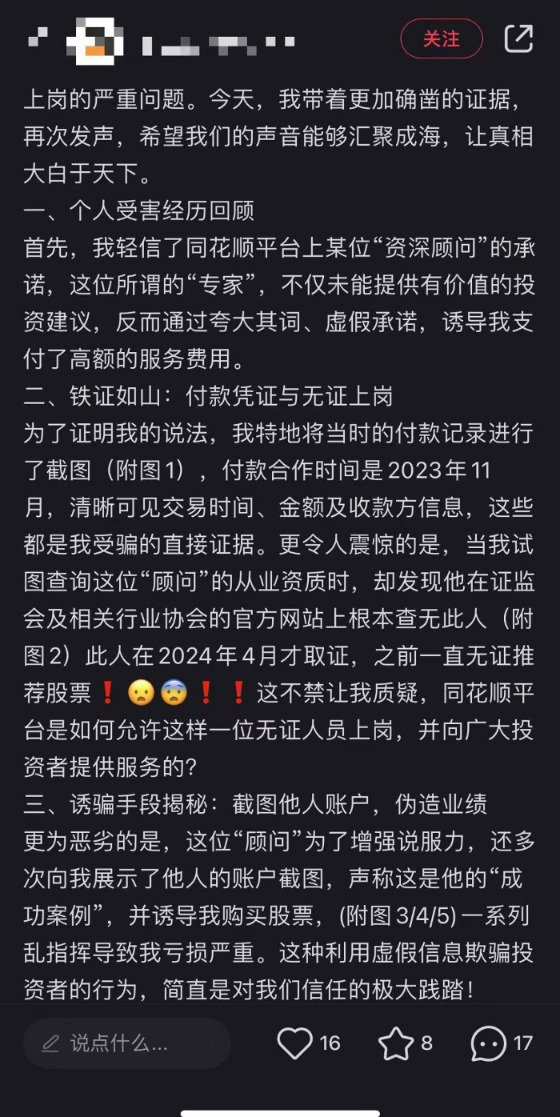 如在某社交平台上,有投资者指出,“曾轻信了同花顺平台上某位‘资深顾问’的承诺,不仅未能提供有价值的投资建议,反而通过夸大其词、虚假承诺诱导支付高额的服务费用。”