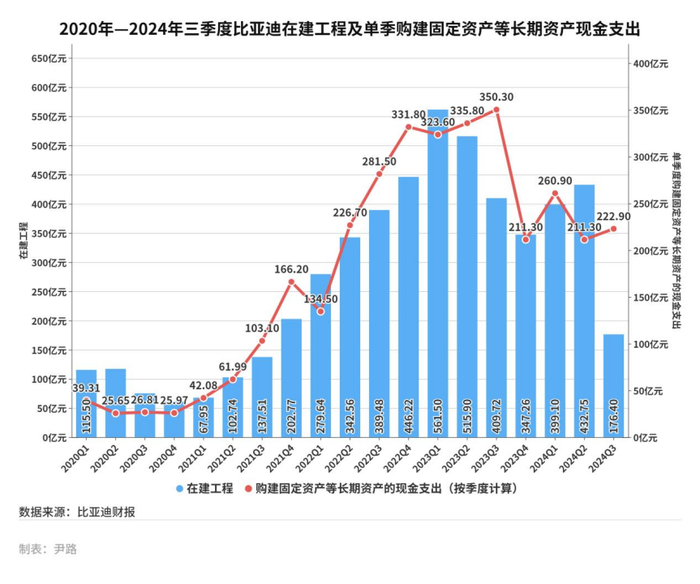 通过统计我们发现,2024年以来,比亚迪购建固定资产、无形资产等长期资产的现金支出显著减少,同时在建工程也开始逐步转入固定资产,这表明工厂逐步建成投产。