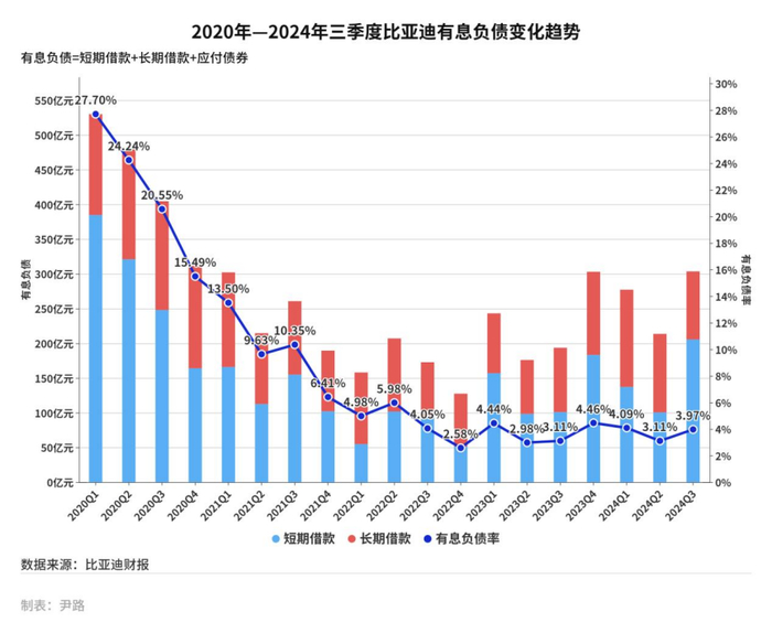 真正带来债务压力的是有息负债,而比亚迪的有息负债近年来显著下降。