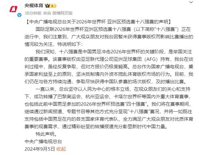此外,今年9月,在国足世预赛18强赛首场比赛之前,央视官方曾发布声明回应不转播国足比赛,表示经反复争取,对方报价仍极度畸高,因此暂未获得赛事版权,将继续通过新闻报道、专题节目等其他方式充分呈现赛况。